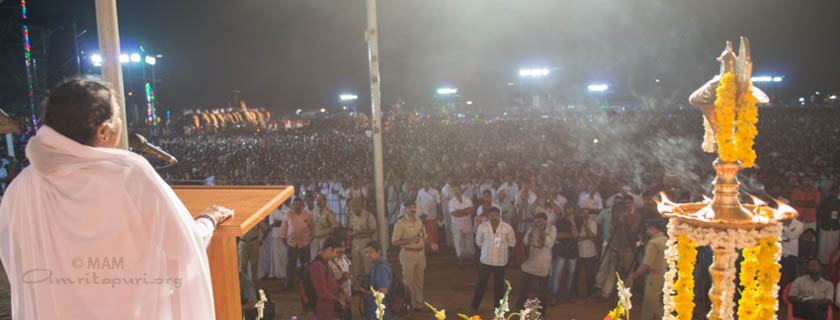If we watch Amma, we will see the embodiment of all the divine qualities she is constantly encouraging us to cultivate. If you want to understand devotion, watch the tears as they roll down her cheeks during bhajans. If you want to learn about serving the world selflessly, sit by her side one evening as she embraces 12,000 people. If you have questions about sadhana, envision her years on the seashore when she sat motionless, completely estranged from the world. And whatever Amma does, it is meditation, whether sitting in silence, speaking to thousands or sweeping the ashram courtyard.